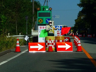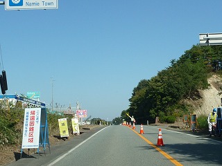 さらに進んでいくと除染工事が行われており片側交互通行となっていました。あれ、警戒区域(帰還困難区域)内なのに?と思いましたが、実はここが双葉町と浪江町の町境でありまして(右上画像をよく見ると情報に浪江町を示す看板の一部と、「期間困難区域 ここまで」と書かれた看板それぞれが見えています)、ここから先のエリアは「避難指示解除準備地域」となるわけです。 |