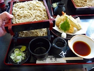 「そば処 木音(きね)」というお店でしたが、人気店なのか開店直後からどんどんお客さんがやってきます。何にしようか一瞬悩みましたが、「おすすめ品」があったのでそちらを注文。1つは天ぷら付きでもう1つは単品です(左上画像マウスオン)。ちなみにそば粉は会津産のものを使用しているようなのである種願ったり願ったりです(笑)。まだ新蕎麦じゃなかったようですが、うん、美味しかった! |
