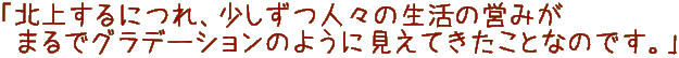 雑草に覆われた平地(放置された田畑)ばかりだったのが、「あれ、あそこの農地、トラクターが入って整備した形跡がある」とか、「あ、今通り過ぎた家、見える側の窓のカーテン開いてた」とか。そして「あ、あのお宅、布団を干してる!洗濯物も!」に至るわけで、特にお布団を見たときは嬉しくなりました。だってそこには間違いなく「日々の営み」があるわけですから。そしてそれは、2014/3に富岡町からいわき市方面に南下したときに感じた変化とそっくりそのまま同じだったわけなのです。 |