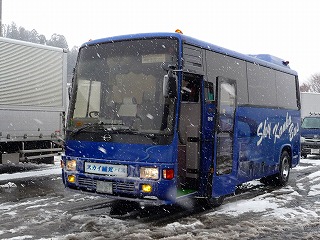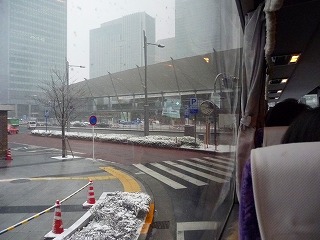 ひぇー朝になって電車止まっていたらどうしようと思いつつ早起きして窓の外を見ると‥「うん、雪は降っているけれど路面は完全に見えている!」。この時点ではまだ電車も普通に動いているということで安心安心。集合時間よりもかなり早く着いちゃって時間をもてあましましたが、ギリギリ到着で気をもむよりははるかにマシです(時間に余裕がないとイライラする性格なのでこれは精神衛生上もとってもヨロシカッタんです)。 で、しばらく八重洲地下街でうだうだした上で8時過ぎに集合場所に上がってみると‥おお、バスがやってきました(中型サイズ)。名前の確認後乗り込みましたが‥うわー、予め決められた座席表によると「一番後ろ」なんですよ。鉄ちゃん小学生じゃないですが一番前が大好きなTakemaなんだけれどなぁ(苦笑)。まぁ何はともあれ東京駅八重洲口を定刻に出発です! |