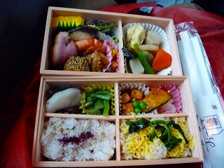 なんだぁ道を間違えていただけなのかっ!(それにしては豪快なミスルートですが(笑))。ちなみに今回配車されたバスは埼玉県川越市をベースとしているということで、ドライバーさんは都心および首都高の細かなところをよく知らなかったのかなと。Takemaを最前列に座らせてくれればちゃんとナビしましたのに(笑)。 ま、それでもこの時間は首都高も東北道も問題なく通行可能だったのでラッキーでした(東北道は途中から?50km/h規制だったようですが)。さ、首都高川口線に入ったところで東京駅構内にて買っておいたお弁当タイム&朝から飲酒行動開始といたしましょう! |