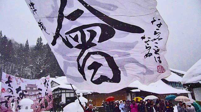会津そして福島の心意気を示すかのごとく、大内宿に大旗が豪快にうち振られておりました(旗手と旗の大きさを比較してみればおわかりかと)。