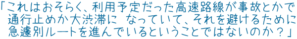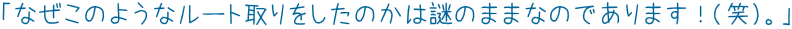 いい加減なトレースなので結構ずれていたりしますが環状線をほぼ5/6周してますよね(笑)。ちなみにこの謎は最初の休憩ポイント(羽生PA)到着直前にアナウンスで知らされました。いわく‥ |