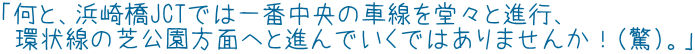 | と想像したわけです。となると、この先の浜崎橋JCTから芝浦JCTを経由して11号台場線に入って湾岸線東行きに進行し、葛西JCTで中央環状線に入って北上するのではないかと想像されます。ふーむまぁこれもルート取りとしてはあり得ない話じゃないなと思いつつ窓の外を見ていると‥ |