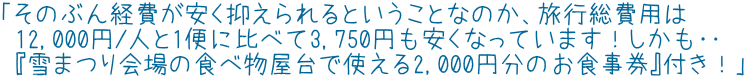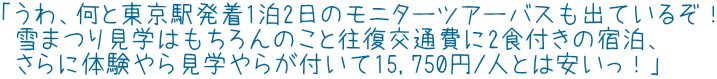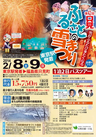 うん、さすがに宿泊キャパのこともあるでしょうから当然ですよね。というわけで詳細を聞いてみると‥ 出発は本運行の第1便より1時間15分遅い8:30に東京駅出発(なお、これ以降われわれが利用する臨時便のことを「2便」と記載します)。で、1便が立ち寄らない大内宿の雪祭り見学&各自昼食のあと南会津町(旧南郷村)のさかい温泉さゆり荘にチェックインし、そのあと只見ふるさと雪まつり会場へ移動し会場で各自夕食、花火終了後宿に戻ってくるのが約22:00。翌日はゆっくりと10:00に宿を出発して、サブ会場の只見スキー場でスノーモービル体験後再び雪まつり会場にて15:00までのんびりし(各自昼食)、そのあと一気に東京まで戻ってくるというスケジュールなのだそうです。 ちなみに食事の提供は2日目の朝のみで、あとは各自でということなのですが‥ |