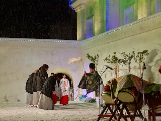 厄男の皆さん全員が舞台に上がったあと、まずは大雪像たるオペラ座に礼を尽くします。このあたり、フツーの日本人にとっては特に違和感もないのですが、つい前日まで重機を入れて造っていたこの雪像に「いつ神が降臨したのか?いつ神殿になったのか?」を一神教徒の方々に説明するのは結構難しいかも知れませんね(笑)。ムスリムの方々はステータス(象徴たる偶像)否定の観点から「ここに神はいない」とお考えになるような気もしますし、クリスチャンの方々にとってみれば「そもそも異教徒が造った建物を模したモノにどうして日本の神とやらの神性が瞬時に宿るのか」について「??」となってしまわれるかも知れません。でもこれが「八百万の神々」をいただくわれわれの感覚なのですよね。鷹揚な宗教的感覚をもとに自然にそう振る舞える日本人のこの感覚を外交方針にも是非取り入れて欲しいと思ったりするTakemaです(ただしその感覚が相手も理解可能であると思いこんだりしたら薮蛇ですが=ありがちなので)。 さて話をバイザウェイ系に進めることととして続いては「厄男代表挨拶」へと進みます。もちろん挨拶役は先ほどの動画で「者共、行くぞぉっ!」というお言葉とともに切り込み隊長としてすっ飛んで行かれた方なのですが、学生時代はやっぱり生徒会長とか体育系クラブの部長だったのかな?でもこのような「熱い男」がおられることで只見町の未来がさらに切り拓かれていくんだろうなと心強く感じた次第です。何だかジジイっぽい表現ですが、地方に熱い人材がいないとダメなんですよ!では再び動画で‥。 |