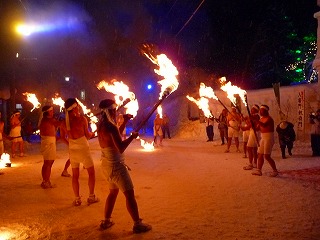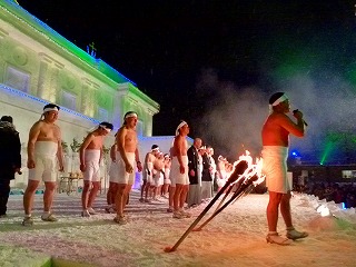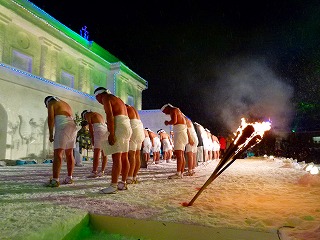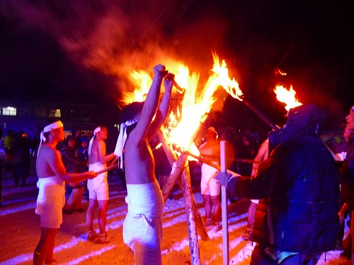 雪まつり会場入りした厄男の皆さん、場内に何ヶ所かあるかがり火に着火中です。ではここに至るまでの動画もご覧下さい。