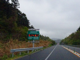 ![]() いわき市の北部にさしかかったあたりで明るくなりました。「0.1-4.1」、また下がってますね線量値。 |