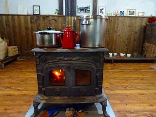 GWだというのに(正確には前日ですが)店内には火が焚かれていました。そのストーブの上に寸胴やら鍋やらポットやらが置かれている風情は大好きですね(笑)。 |