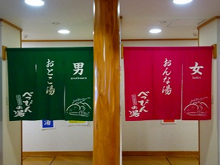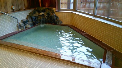 カーテンで仕切られた湯口(打たせ湯方式で湯を投入しているので跳ね湯ブロック用でしょう)からはやや金気&土系の味がある適温湯がずどどどっと落とし込まれています。これは絵的にナニだなぁ!と思いつつも、先客さん多数なのでカメラはなしです。湯ざわりはツルすべといったところでしょうか。 |