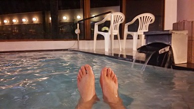 あれ?夕食前に実は入っていた小浴場では明確に(中レベルで)感知した塩素臭が全然ないんですが?もっとも利用度からすればこちらの大浴場のほうがはるかにナニのはずですから、「塩素玉が切れたのかな?」ということにしておきましょう。むろん消毒方法にはさまざまな方法がありますから、こちらも古風な塩素玉設置方式ではないと思いますが。 |