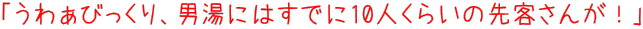 で、ひさびさにびっくりしたのが循環とはいえ湯ざわりのツルツル感!いや、一部のTakema肌は「これはほぼヌルと表記してもよし」と主張しておりました。お湯の素性はいいですねー。 |