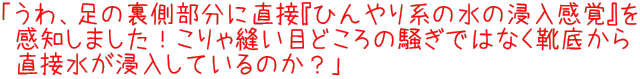 というわけで確認してみると、「う゛ゎ、左右の靴底とも同じような場所にひび割れが‥」。なお両靴ともというのがポイントで、片足だけだったらこれ以前にも靴底からの浸水を疑ったでしょうが、これまで両足とも均等に浸みてきていたので縫い目かなと思いこんでいたわけです。というわけでこの翌日通る大都市八戸にて靴を買うこと決定!あやしいゴム底じゃなくてビブラム底の靴を買いますよ。 |
