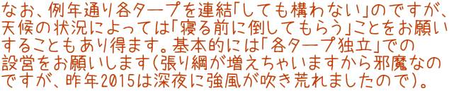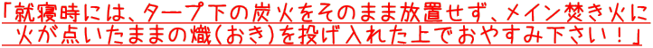 昨年(2015)には深夜の強風で火の粉が舞い踊っていました。それでもメイン焚き火だけであれば何とか対応もできるでしょうが、タープ下の炭火状況までは把握できません。火が熾ったままの炭火台の上に倒壊したタープが被さったら‥。というわけでこのことだけはよろしくお願いいたします。