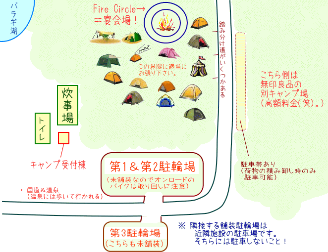 なお受付は各自で行わず、宴会開始までに「お支払いタイム」を設けますのでその時に庶務雑務係員である Takema&おしんこどんにお支払い下さい(キャンプ場の窓口終了前に、そのタイミングでの参加人数を確認した上でわれわれが一括で支払います)。なお、この時間に未着等で払いそびれた場合などは到着時にTakema&おしんこどんまでお支払い下さいませ。