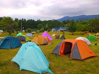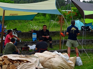 | そんな早々到着&設営完了組(われわれ夫婦も含む)はいい意味での「脳天気モード」にスイッチオンしておりましたが、いわゆる「普通タイムの夕方到着組」の方々は「早く生ビールを口にして楽になりたい!」との一存から懸命のテント設営です(笑)。というわけで敷地内にはどんどんサナギ型テントが増えていったのでありました。広いように見えて案外傾斜があるので場所の選定には苦労するんですよね。 一方で円形タープの設営作業も進みましたが、今年は参加人数がここ数年に比べ少なかったこともあり「何とかつながった」という感じでしょうか。いやつながればいいというわけでもないですが(笑)。ちなみに設営中の皆さんの中から「今年は連結はしないってことだよね」という発言を耳にしたTakema、「常連の皆さんもちゃんとお知らせページを読んでくれているんだな」と嬉しくなりました(感謝)。おっと、タープのポールが一部足らなくても今年は長尺の薪があったので何とかなったのかな?(右上画像マウスオン)。 |