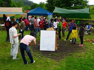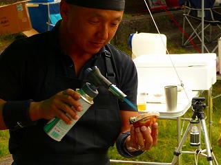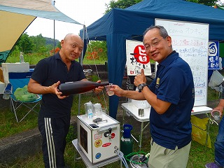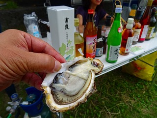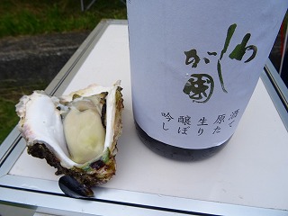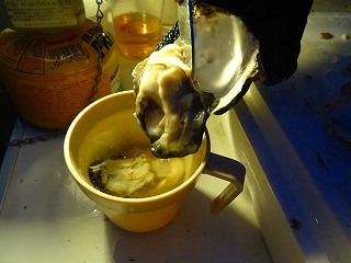 | さて、佐久間さんから差し入れいただいたのは一般購入できない?一升瓶ワイン。酸化防止剤は残念ですがこれが日本の行政指導ですからしょうがないですね。自分的にはさっぱり系が大好きなので美味しかったです。なお念のため一部にぼかし加工を施しましたが、別にご禁制の品じゃないはずです(笑)。 さてここからはしばし隠密行動へと進みます(大笑)。参加者の皆さんのほとんどはご存じなかったと思いますが、実は中央テントに立てかけられたホワイトボードの裏側で「ヒミツの牡蠣試食タイム」が行われていたのです(苦笑)。黙っていてゴメンナサイ、だって数がすごく少なかったので‥偶然近くに居られた○パさんや○尺さんたちだけがラッキーご相伴と相成りました。 |
