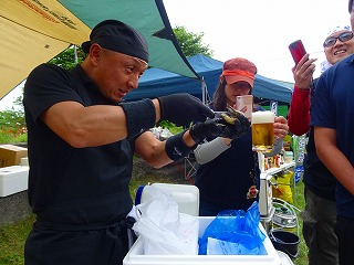| さぁって!集合写真と乾杯さえ終わってしまえばもうこっちのもの!動画の最後にもあったとおりここで大船渡赤崎産の「高級」岩牡蠣ぶるまい開始です! |