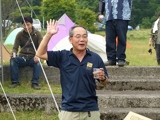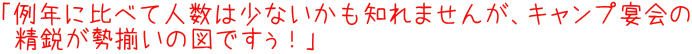 | このあとTakemaによる説明も行いましたが、参加者の皆さんからは「長いぞー」との声も(笑)。確かに寄る年波ゆえか長すぎでしたね。そんなこんなでいよいよ「乾杯のご発声」をおとうからいただきました!(左上画像マウスオン)。それにしても、Takemaオフにおとうのご発声ってずいぶん前から恒例にさせてもらってますよね‥(おとう、お手数をかけてすみません)。 |