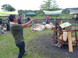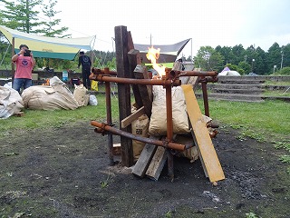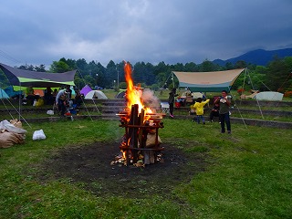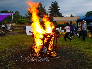 | さてそろそろ夕暮れ‥というわけで、koh1さんに「キャンプファイヤー点火の儀」をお願いしました。あえて上部に点火なさいましたが、大丈夫、しっかり乾いた木材揃い&袋の中には燃え萌え系の材料が入っているというわけです。というわけでほどなく‥ |