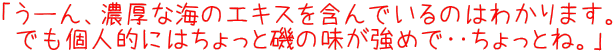 | で、続いて大黒神島の牡蠣を。うん、こっちの方がストレートな牡蠣の美味しさを味わえる感じで美味しい‥と思っていたら、しっかりどんでん返しがありました(笑)。「先端」のほうは基本的な殺菌を施さない最新の栽培方法を用いており、「大黒神島」のほうは出荷前に紫外線照射殺菌(三陸でも多く用いられている手法かと)を施したものなのだとか(ちなみにそれぞれの牡蠣の栽培地はさして遠くないのだそうです)。 佐久間さんいわく「紫外線をあてるとどうしても身が萎縮してしまうんです、そのような外的刺激をできるだけ加えずに出荷したいという思いが『先端』という名付けに関係しているわけです」とのこと。なるほど、考えてみれば人間の場合でも放射線治療などを行えばそれだけ身体はダメージを受けるわけで、身の小さな牡蠣となれば当然‥。 ふと思ったのは、「ということは、牡蠣殻の中にあった海水も同様に殺菌されていたからこそ、自分としてはトータルで『大黒神島』のほうを好んだ」ということかな?まぁ1個ずつしか試食していませんのでエラソなことはいえませんが、生牡蠣一つとっても味の好みはそれぞれでいいと思います。個人的には厚岸界隈の牡蠣も好きですが、北海道で食べる場合は除きTakemaが今後注文するのは三陸産が基本です。だって、 |