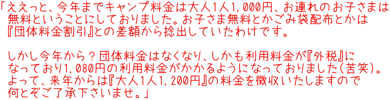| キャンプ宴会の翌朝の精算後に「何だか高いよそれ」とおしんこどんからの指摘を受けて確認したところそんなことになっていたわけで(苦笑)。まぁ今年はもう済んだことなので来年からということで。 なお「お子さま」の定義はどうしようかなと考えたのですが、キャンプ場の定義とは違いますが「家族であれば高校生までは無料」といたします。だって、ファミリーキャンプに中高生のお子さんが来てくれるというのは親御さんとしてもすんごい嬉しいことだと思うので。あ、今回ご参加いただいたうちの2家族を前提にしていることは言うまでもありません(大笑)。 |