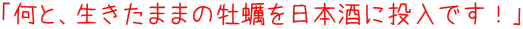 | このページの最後は大量生牡蠣投入の日本酒に興じるTakema画像で〆といたしましょう。ただしこのあとも夜の部は続きます。 |