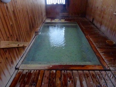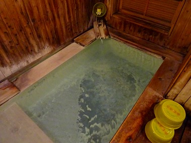 | 男湯には若干フライング気味の男性2人が談笑中でしたが程なく上がり、何とか湯画像を撮ることができました。蔵王の共同湯は一般利用としては比較的湯温が高く酸性泉ということもあるのか、入浴の滞在時間が短めなので助かります(何が?)。ちなみに今回の浴感としてはここ上湯が一番肌への刺激が強いように感じました(おしんこどんは「そうかなぁ?」と言っていましたが)。 |
