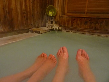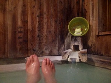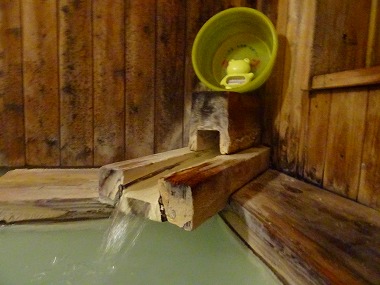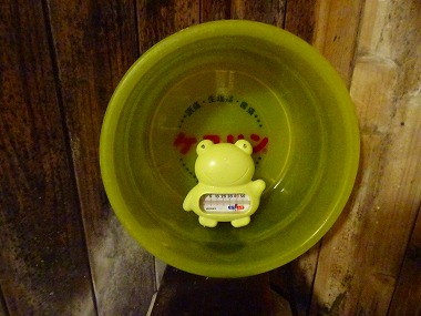 ![]() 浴槽底に沈殿している湯花を見るとどうしても巻き上げて白濁化したくなる性分の夫婦です(笑)。 ![]() 湯口上に祀られている神さま‥じゃなかった、ケロリン桶と温度計ですね。この遊び心はなかなか好きです。 |