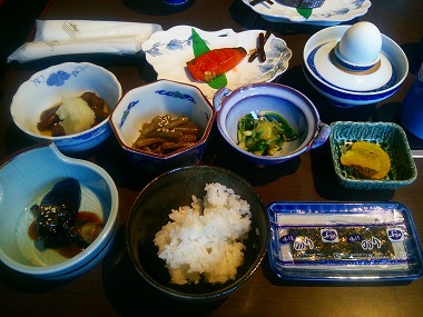 | ちなみにこちらのお湯は自噴源泉(敷地内からの湧出湯)ということですが、すぐ裏に川原湯共同浴場があるので泉質はほぼ同じでしょう。実は予約時にはこちらの宿の場所をよく調べず「もっと県道沿いの方だろう」と思い込んでいたので、宿の裏手にある喫煙可能エリアからかわらや旅館の浴室棟を目にした時には「うそ、こんなに近いの?」とびっくりした次第です(右上画像マウスオン)。そのすぐ手前が共同浴場ですからね。 さて実はこの夜は夫婦揃ってあまりよく眠れず。おしんこどんは「硫化水素のせい?」とのたもうておりましたが、たぶん部屋の温度が下がらず寝苦しかったからでしょう(窓は少し開けていましたが)。というわけで6時ころ、「よし、昨日入り残した上湯に行くよ!」ということに。 |