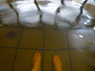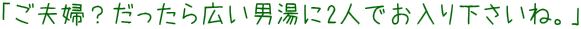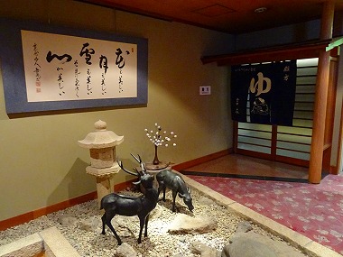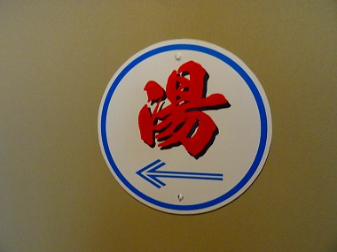 | 「湯」の矢印に従って進んできたところにお風呂入口がありました。と、ここにおられた従業員さんがこんなひと言。 |