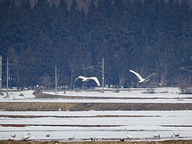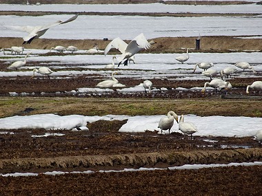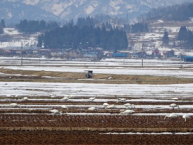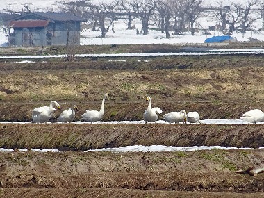 | 田んぼなぞはどこにでもあるのにと思うのですが、3月下旬のここ東根村山界隈には北へ向かう直前であろう白鳥がわらわらといるのですよ。以前たまたま裏道を走っていて知りました。R13からでも見えなくはないですが交通量の関係で車を止められないしね。脇道正解!です。 |