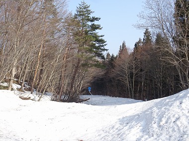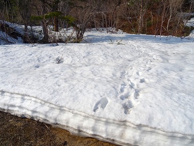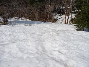 | というわけで「現場入口」に到着です(笑)。とはいえ何か目印が付いているわけでもないですし地図を見ているわけでもありません。往年の記憶だけが頼みです。実はこの数日前、温泉の先達諸氏がここを訪問した画像をアップしておられたと聞いているので、ただ単純に煽られただけであるともいいます(笑)。おしんこどんともども長靴に履き替え、この辺かなと見当を付けながら山の中に入っていきます。 ここ数日の暖かさで溶けたのか雪上に先達の足跡は全く残っていません。しかも、すでに時間が午後2時を回っていて、雪がユルユル、しばしば踏み抜いてハマりました。まぁしょうがないわなぁ。 |