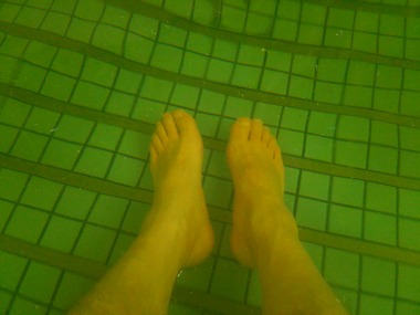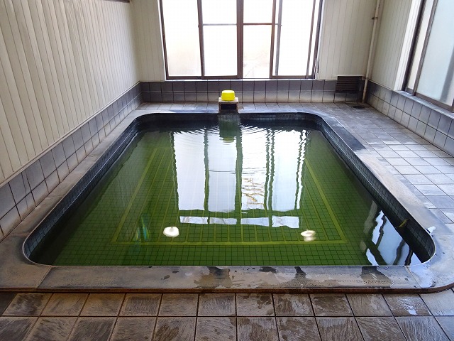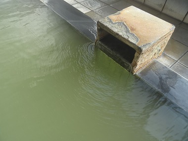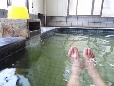 | よく見るとまだお湯がオーバーフローしておりません。ということは「湯溜めの最終段階=この日一番の新鮮湯」というわけで、川渡の湯をタンノーするには絶好というわけです。 たしかに湯が溜まった直後ゆえお湯が透明で浴槽底のタイル目地がしっかりと見えてますね。これが時間が経つと見えなくなっちゃうわけです。 |