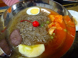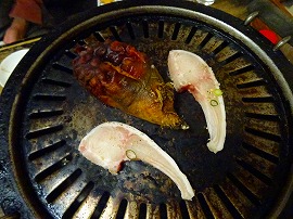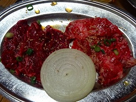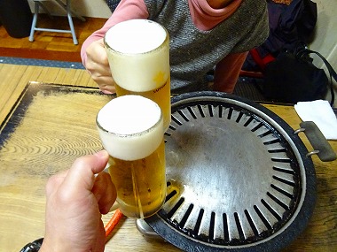 | というわけで歩くこと約40分でお店に到着!温泉ファンの梁山泊ともいわれる?焼き肉八兆ですが、この日は平日ということもありわれわれ以外に温泉ファンらしきお客さんはいないようでした。そのかわり、あとから知ったことですがお座敷に楽天イーグルスの現役選手(岩出山出身)およびご家族の方々がプライベート宴会を楽しんでおられたようで、ほかのお客さんがそれと気づいてびっくりなさっていましたっけ。 |