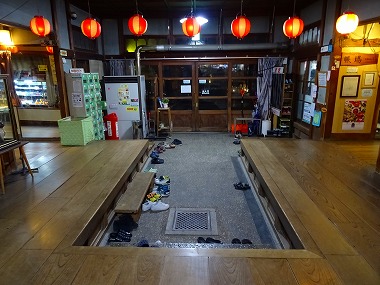 | 到着はまだ4時前でしたんで、まずは大浴場で野湯の汗(というか砂とか泥)を落とさねば!でも大浴場にはおくつろぎ中の先客さんが複数おられたので、まず洗い場でしっかり身体を洗い湯には軽く浸かるにとどめ、日帰り利用だと別料金となる中浴場へと移動します。いずれにせよ夕方になればなるほど混んでくるはずなのでその前に!という行動です。 |