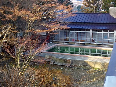 ![]() なかなかシブイ感じの湯治棟です。われわれの部屋は「竹2番」でした(右上画像マウスオン)。 |