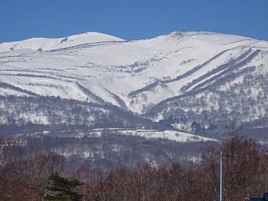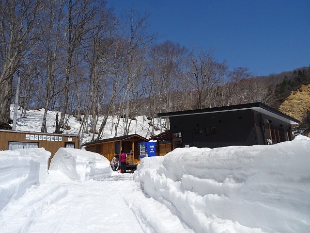 | しかしそれも駒の湯の手前まで。駒の湯に下る坂道から先は冬の間除雪車が入りませんので、この時期になっても積雪はご覧のとおりたっぷり。湯守が除雪機で一条の「道」を開削しただけの状況でありました。もっともこの「道」があるかないか自体がものすごく大きな違いなんですけれどね。 遠くから手を振ると湯守も気づいてくれたようで手を振り返してくれました。ほぼ3ヶ月ぶりの再会です(2017年末にも来ていますので。その時のページはこちら)。 |