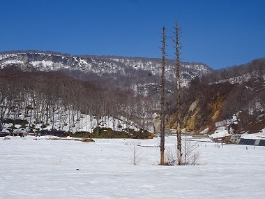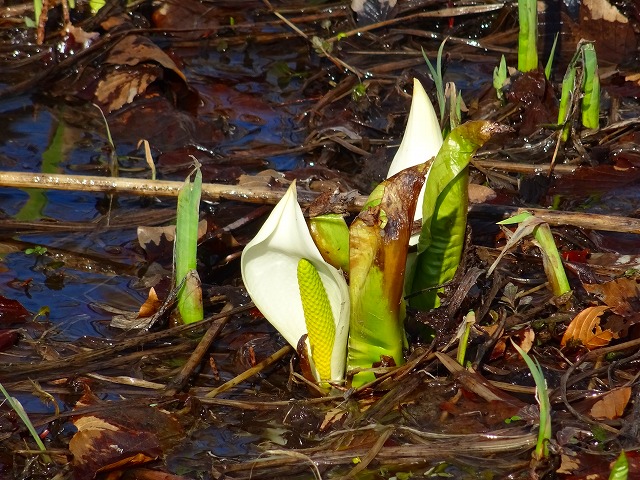 | やはり雪国に生えるフキノトウは多少大きく育っていても苦味が少なく美味しいです。ちなみにこのあたりでは「花の部分は食べず茎部分を調理する」のが一般的なのだそうで、確かに花は多少苦味も強いし食感ももそもそしているからなぁと納得した次第。 明けて翌朝‥なのですが、朝食前にTVで「栗駒耕英地区でもミズバショウが咲き始めた」というニュースが報じられました。どうやらご夫婦の知り合いの方が画像付きでTV局に投稿なさったようです。ここからすぐの場所なのはわかっているので、朝食前にちょっと見に行ってみることに。 |