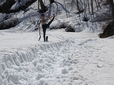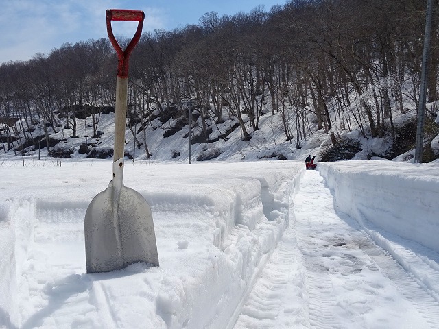 | と思ったら足を上げたりしていますが(笑)、上の方の除雪前画像と比べると「山がなくなった」ことが一目瞭然です。ご夫婦だけでこれをやるのは大変なので、皆さんどうぞお手伝いにお越し下さい(どの時期であっても手伝えることはあるはずなので。なお事前にご連絡を。駒の湯のブログにメールアドレス、公式サイトに電話番号が掲載されています)。 |