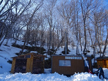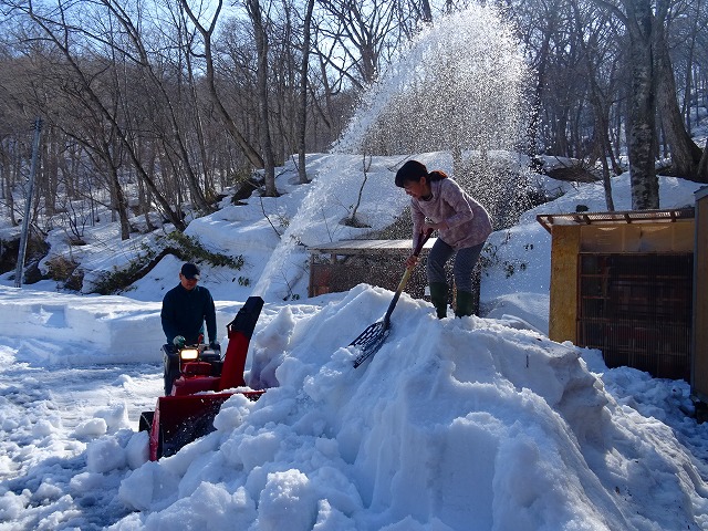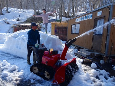 | というわけで道路開削雪かきのお手伝いです。まずは湯小屋手前に広場を作り、さらにはアクセス路の幅を広げて荷物搬入の軽トラックが入ってこられるようにしなければなりません。とはいえこの日と翌日の午前中だけのお手伝いだけなので、そこまで終わらせるのは不可能ですが‥。 |