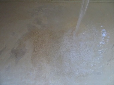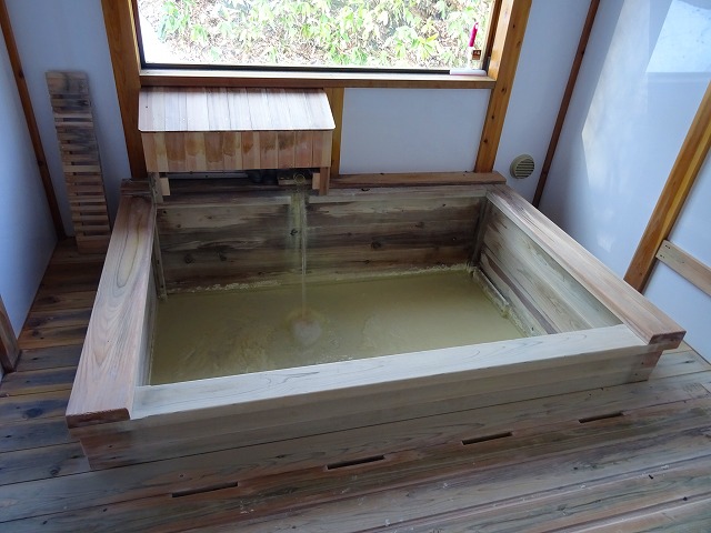 | 駒の湯の源泉は自然湧出ですから冬の間もこんこんと湧き出し続けています。しかし定期的に手を入れておかないと配管等も詰まってしまいますし、浴槽にも大量の湯の花がたまってしまいます。透明湯が空気に触れることによって成分を析出させるというのはそれこそ川渡温泉も同じわけで、だからこそどこのお宿も日々完全に湯を抜いて清掃しているわけです(まぁ数日に1回とかのところもあるでしょうが)。 いっぽう駒の湯では冬の休業期間中も(天候や現地の状況にもよりますが)1-2週間に1度はやはり掃除をしているそうです。この場合、営業期間と同じようにオーバーフローさせたままにしておくと、それこそ浴槽や床全体に湯花が付着してしまうので、ご覧のように最低限の湯だけを張ってあとは排水させているのだとか。完全に排水口を開放してしまうとたぶん飛び散った湯の成分が乾いて固着してしまうので、それを避けるための低位湛湯なのでしょう。 |