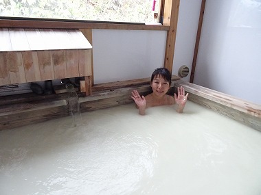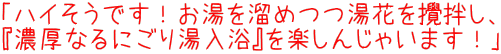 | いやぁスバラシイ!ちなみにこの日の源泉温度は‥(右上画像マウスオン)。なるほど、まだ外気温が高くないので源泉湧出部での温度低下、および引き湯パイプを流れてくるうちに多少湯温が下がっているということなのでしょう。営業開始時にはもう少し上がってくれるはず。いや遠慮せずあと5度くらい上がってくれたりしたら最高なんですけれどね(笑)。 |