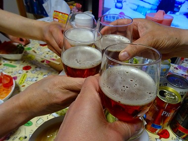 | そんなわけでお風呂掃除も完了し(湯に浸かっただけじゃなくそのあとちゃんと掃除しましたので念のため)、本日の作業も終了です。乾杯!あ、この日のおつまみは‥(左上画像マウスオン)、 |