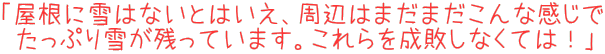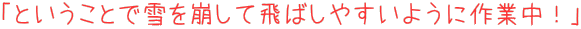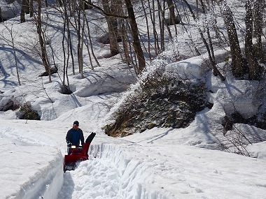 | さてこの日の除雪作業は「出入り道の拡幅」です。除雪機の幅部分だけ深く掘り下げたところで、それではいつまで経っても軽トラが入ってこられません。よって、両サイドの雪をスコップで落とし、その雪ブロックを除雪機で吹っ飛ばすという作業となりました。 |