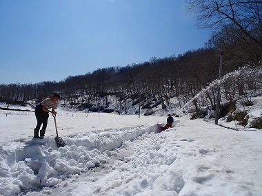 | さて、日が陰ってくると雪が締まって固くなり効率が悪くなるので次の作業に移りましょう。これはもう、われわれ夫婦とも慣れたもの、それは‥。 |