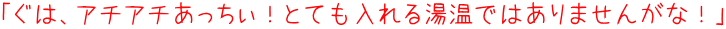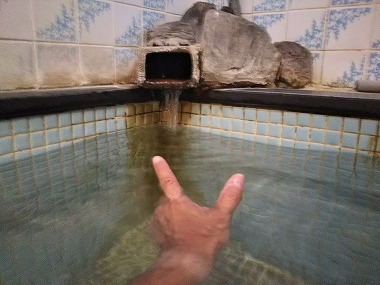 温度系は車に置いて来ちゃったのですが(最近こういうパターンが多いな)、手指フィジカル温度計測によると余裕で50度を超えているようです。というわけで物理的冷却作業に即移行、まずは洗い場の水栓蛇口を湯船に向けて直接冷却開始!それと、「湯口も湯尻も浴槽上部から投入&排出という構造上、熱いのは上だけで浴槽底はぬる湯になっているかもしれん」という読みのもと、洗面器を手にして草津方式の湯もみで攪拌攪拌また攪拌! |