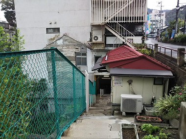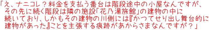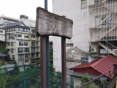 ちょっと先人の記事を追ってみると、、この番台小屋の向かいにはかつて確かに建物があり、しかも左上画像の撮影地点左側にも別の建物があったようです。でもその頃もすでに共同湯は花乃湯の建物地下だったようで‥このあたり、いろいろな絡みがあるんだろうなと(深くは詮索しません)。 |