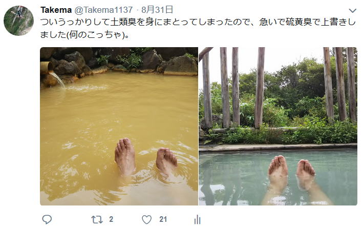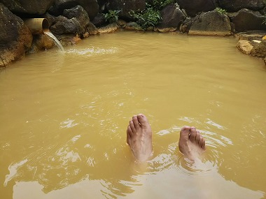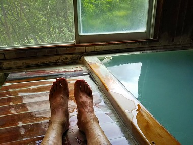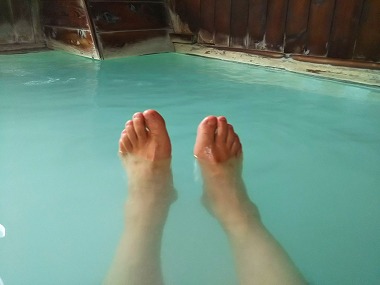 いつもの湯足画像ですみませんが、ややぬるめの硫黄泉をまったり。どなたも来なかったのでちょっとトドってみたりして(笑)。ところで今回初めてご主人が「1時間以内でお願いします」とおっしゃいました。日帰り入浴&休憩の予約でもあるのかなと思いましたが後続のお客さんはなし。ということは‥ |