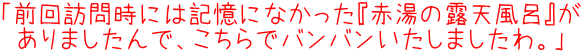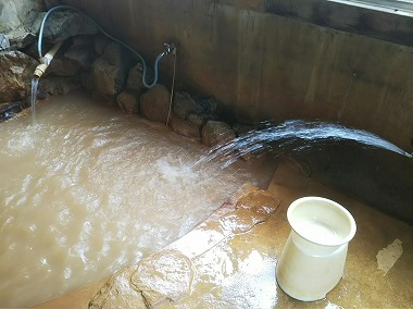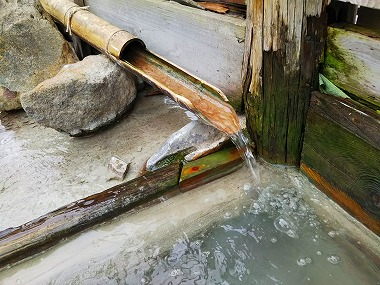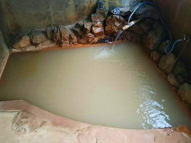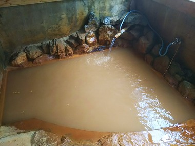こちらの湯は赤湯ではなく別源泉の硫黄泉ですが、マイルドでこなれた感じです。湯温もバリ適温、この時の車の車外温度計は20度だったので、そこそこ外気に冷やされていることもあるのでしょう。 |